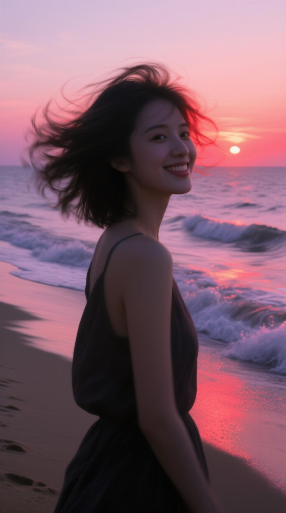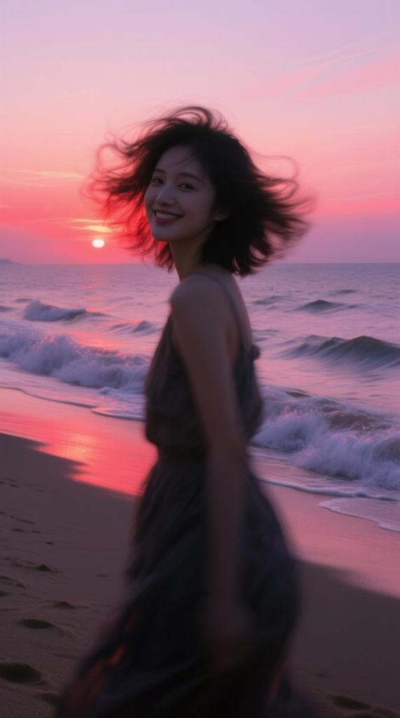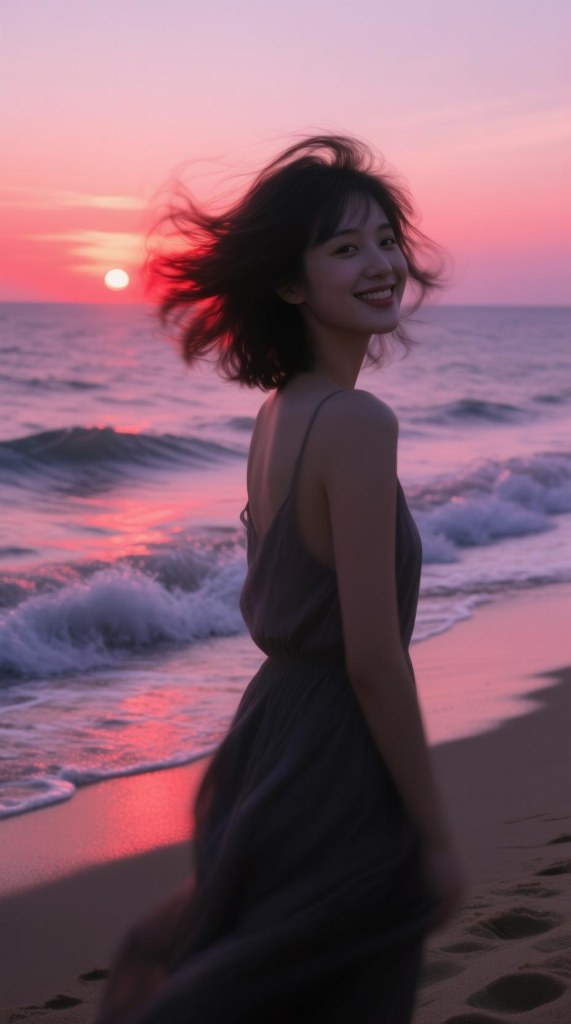 风中回眸半身,惊艳容貌,蓬松刘海在海风中飘动,动态模糊和发丝分离如落日余晖,嘴角上扬带生活热爱,侧身正面照,暗调转化为沙滩落日氛围,有沙滩夕阳余晖,海浪拍打,超现实主义与印象派融合,细节有沙滩质感,海浪波纹,落日色彩描绘,色彩以红粉紫为主,淡彩且温暖,低光氛围浪漫温馨宁静,个性视角非对称,对焦人物主体,周边虚焦暗朦过曝模拟沙滩光影交错,景深,高噪点,强烈胶片颗粒质感,层次丰富,暗角是无垠大海,写意,光的美学,概念艺术,超现实,高级感,富士胶片,杰作,曝光感,