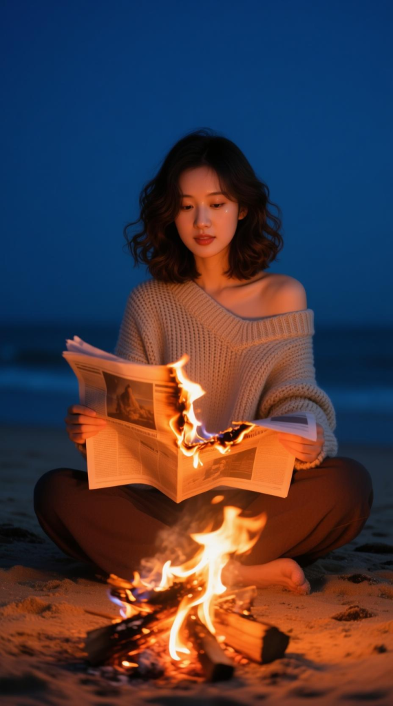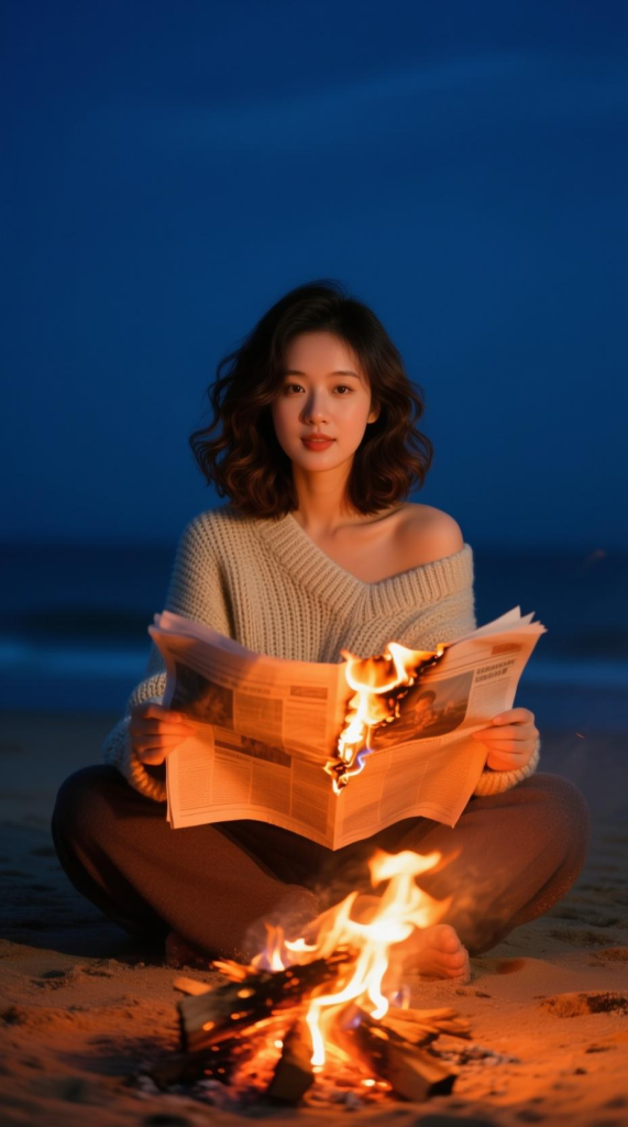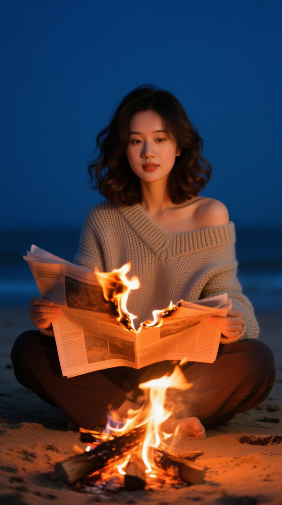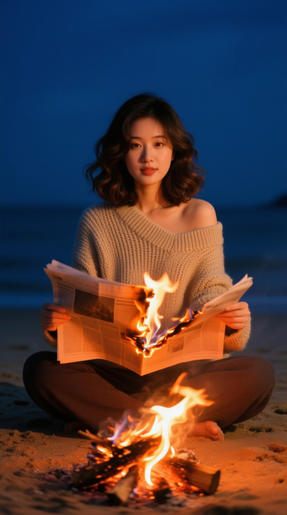 大雄 出图预览 随机展示 2025-09-09 篝火旁的报纸与她-出图预览 出图预览: , liblib-里布里布Ai-【点击跳转】 基础算法:qwen-image 尺寸:928×1664 步数:30 采样器:Euler CFG:4 提示词: 年轻的亚洲女性,皮肤因温暖的光线而闪闪发光,齐肩波浪形头发,超大针织毛衣从肩上滑落,晚上盘腿坐在海滩上的小篝火旁,手上拿一张正在燃烧的报纸,报纸被火烧到一半,深蓝色夜空下的高对比度暖橙色火光,电影胶片纹理,腰部向上拍摄