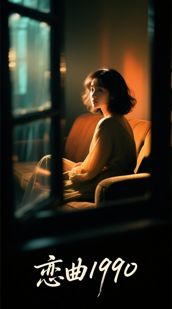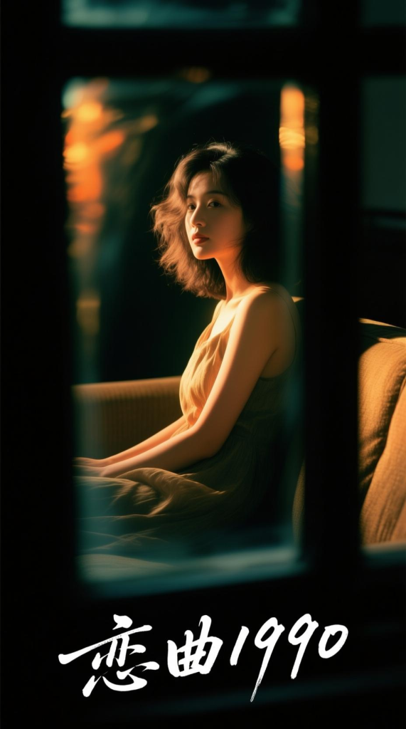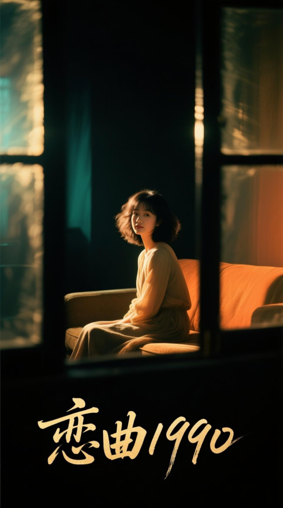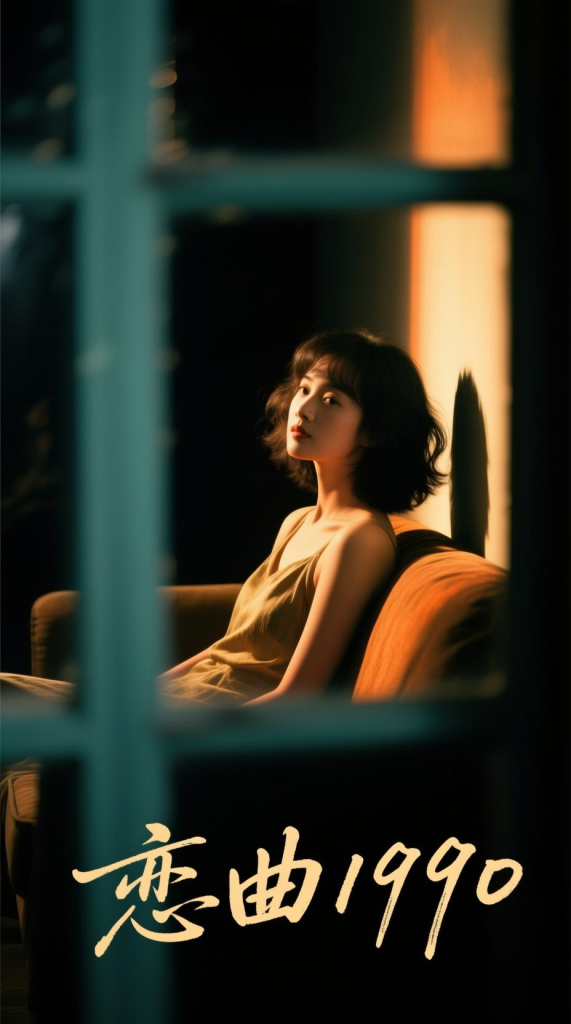 色彩光影完美结合,伦勃朗光,逆光拍摄主角,主角主光侧加一道强光,辅助塑造人物形象,增强画面质感,营造氛围,光反差给人以强烈的视觉冲击,前景遮挡(景窗),blurry_foreground,偷窥的第三视觉,留白+弱光 (绝大部分的画面掩藏在黑暗中,只有一小部分明亮区),镜子映射,反射,折射,虚实结合,局部超微矩镜头,强化视觉效果,突出动作细节,表达含蓄,紧张感,过朦,overexposure,高曝,曝朦,弥散模糊晕染,dreamlike,王家卫风格,深景,环境暗调,色彩反差,高饱和,高清,32K,画面简洁,焦点突出,高级感,即视感,叙事感,怀旧,双重曝光,慢门,梦幻柔美,低调摄影,以黑金,青橙为主色,大师级作品,画面:一个女生慵懒懒散的坐在沙发里,少女回眸,惊艳的容貌,蓬松刘海,东方美女,图像下方有手写的书法风格“恋曲1990”